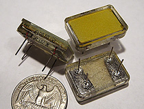 The ITEL2 family of devices, manufactured by the Soviet Union, are small electroluminescent phosphor displays that were produced in a variety of different colors. Unlike most other Soviet electroluminescent (EL) displays, the ITEL2 devices do not display characters or segments, each panel can only produce a solid rectangle of phosphor. Each display contains a sandwich of phosphor pressed between a tin oxide window and a conductive back, which emits light when subjected to a high voltage. The entire display structure is sealed in a flat glass envelope with underside leads that are designed to be soldered into place. Soviet EL displays are very rugged, but require an AC voltage of approximately 200 volts at 400hz to function properly. These displays were likely intended to be backlights for panel buttons with printed transparencies, though anecdotal evidence suggests they were also used in multicolor bar-graphs and other similar devices. Unfortunately, ITEL2 indicators are only rated for a lifespan of approximately 2000 hours. The modern experimenter should mount these displays in sockets when utilizing them in a new project.
