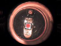 We don't know much about this part, other than that it is a very early device made by HP, and appears similar in outward appearance to the Monsanto MV1 and MV2. The diode has the same gold plated metal can package and 'anvil head' style contact pad as the archetypal Monsanto MV2. Only when viewed under high magnification do significant construction differences begin to appear: the die in this LED has a substantially different top contact. Unlike the MV1, which has a simple circular contact, the 1842-7329 has a series of 'fingers' which extend into the GaAsP emitting section of the die. The fingers appear to do nothing to help the diode's brightness, as the 1842-7329 is just as dim as other diodes from this era.