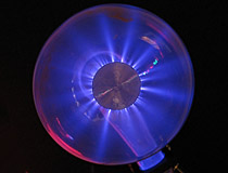 This rather eye-catching device is a handheld Tesla bulb from a Fischer diathermy machine, a sort of quack medical device consisting of a Tesla coil wrapped in Bakelite and medical make-believe. The tube itself consists of a two chambered envelope with a disk shaped electrode surrounded by an unknown purple gas. The second chamber of the tube is filled with normal air and is shaped into a handle; this allows an operator to manipulate the tube over a patient without being shocked themselves. A single electrode on the top of the tube allows it to be attached to the console of the diathermy machine by means of a cloth wire. The gas fill used in this probe is at a much higher pressure than what is typically found in a Geissler tube or Tesla bulb, which is what causes the unusual ribbon-shaped discharge seen around the center disk.