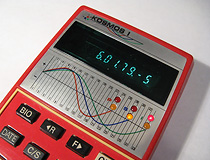 The Kosmos 1 'Love Machine' is an unusual combination biorhythm and four function calculator that was first produced in 1977. Manufactured in a eye-catching red enclosure, the Kosmos 1 was marketed specifically towards women as a dating tool to measure compatibility with potential mates. Biorhythms are a largely discredited form of numerology based around the theory that people operate on three cycles tied to the date of birth, and that two people's compatibility can be determined based on their respective birth dates. The Kosmos 1's unusual space-age display contains a set of six LED's below the main digit readout, which indicate the state of a person's three cycles when the biorhythm function is used. Fortunately the Kosmos 1 can also be used as a normal 4 function calculator; an internal Texas Instruments TMS1100 microcontroller contains the software for both the calculator and biorhythm functions. The Kosmos 1 was also produced in a much more common 'gender neutral' grey version, targeted towards the general calculator user's market. Other than the case color and packaging, which dropped the "Love Machine" name and marketing, the two versions of the Kosmos 1 are identical.