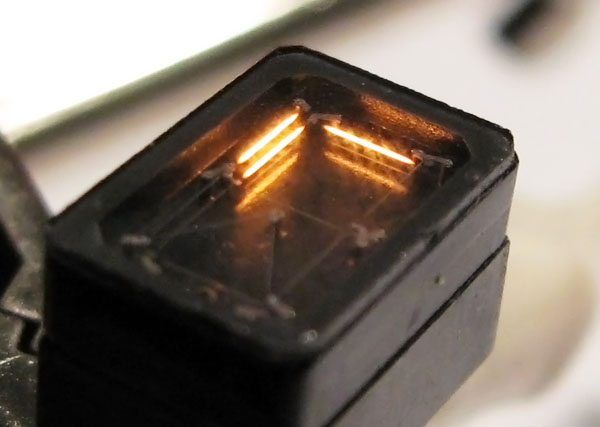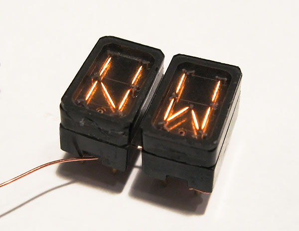 Wamco is a prolific manufacturer of 'minitron'-style filament displays, and produced a number of specialized displays for the aerospace industry. These devices are a good example, a pair of special symbol displays which were originally intended for use in navigation systems. The KW-104EW can display either an "E" or a "W" character, and the KW-104NS can display a "N" or "S" character. Despite appearances, these tubes are not segmented, they can only display the two special characters for which each is designed. Strangely, these tubes actually have doubled filaments in any segment position where the characters overlap, even though it would have been cheaper and less complex to simply share segments in the same way as a normal seven-segment display. Though these devices have a flat package and 8 pin bases, they are not DIP compatible; the pins are arranged in an unusual star-shaped pattern that is incompatible with modern breadboards.