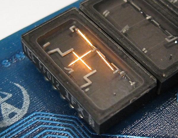 The IEE Aurora handbook contains no mention of any filament displays with patterns other than a traditional seven segment, but the FFD12 is just such a device. The FFD12 contains only four filaments, arranged in the traditional 'plus one' configuration used to display polarity and overflow conditions. Though plus one displays are common amongst other display technologies for use in calculators and digital meters, minitrons with such a pattern are very rarely seen and this is one of the only examples of such a device that we know of. The FFD12 has a package height of 22mm, making it approximately 25% smaller than IEE's flagship FFD21 Aurora display, which is shown above.