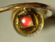 Though we do not have a part number for this obscure straight-pin LED, we can say with almost certainty that it is made by Monsanto. The die can be easily seen through the clear epoxy coating and is identical in brightness and construction to the die found in the Monsanto MV1. Unlike the MV1, this LED does not have an anvil head contact. Instead, the die appears to be directly bonded to the 'stalk' single lead which exits the bottom of the device. The top bond wire (as well as an errant air bubble) can be readily viewed through the clear epoxy.