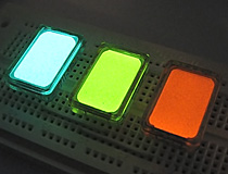 The ITEL2 family of devices, manufactured by the Soviet Union, are small electroluminescent phosphor displays that were produced in a variety of different colors. Unlike most other Soviet electroluminescent (EL) displays, the ITEL2 devices do not display characters or segments, each panel can only produce a solid rectangle of phosphor. Each display contains a sandwich of phosphor pressed between a tin oxide window and a conductive back, which emits light when subjected to a high voltage. The entire display structure is sealed in a flat glass envelope with underside leads that are designed to be soldered into place. Soviet EL displays are very rugged, but require an AC voltage of approximately 200 volts at 400hz to function properly. These displays were likely intended to be backlights for panel buttons with printed transparencies, though anecdotal evidence suggests they were also used in multicolor bar-graphs and other similar devices. Unfortunately, ITEL2 indicators are only rated for a lifespan of approximately 2000 hours. The modern experimenter should mount these displays in sockets when utilizing them in a new project.