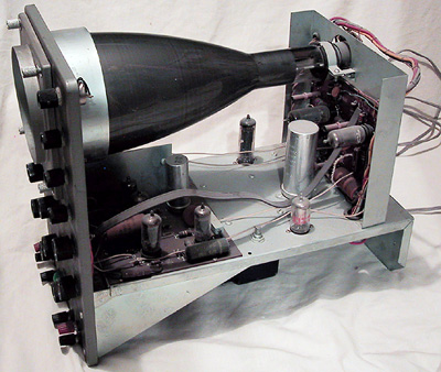 The display is a large RCA 5UP1 electrostatic deflection CRT that is securely supported at both ends. Wire bundles have been tied back for a clean assembly. Other tubes in the scope are spit into three distinct sections: a 12AU7, 12BH7 and 6AN8 on the rear board, a 6AB4, 6J6, 6C4 and 2 12AU7's on the lower board, and a 6CA4 and 1V2 mounted directly to the metal chassis.