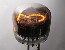 Another very unusual Soviet tube, the ITS1A is an indirect gas discharge display configured for seven-segment number generation. Despite appearances the ITS1A is closer to a Nixie tube than a VFD; the device contains seven gas thyratrons, one for each segment, which are painted with green phosphor. When the tube is energized with a high voltage source and a given thyratron is triggered, the neon fill gas will ionize and excite the phosphor in the triggered segment, producing a piercing green glow. As with the ITM2M display shown above, these tubes have complex power supply requirements and must be supplied with separate -300VDC, 100VDC, and 50VDC signals to function properly. Once these needs are met the tube can be controlled with a 5VDC signal, resulting in a neon display that can be directly attached to a microcontroller with no intermediate hardware. The ITS1A is also self-latching, which eliminates the need to multiplex large displays. Related: An ITS1A 'Thyratron' Clock Project | |