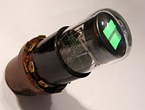 The Tune A Lite is a linear neon bargraph tube that was used as a tuning indicator in several radios during the early 1930s. Tune A Lites were made in both a two pin and four pin version, the four pin model is shown here. Four pin Tune A Lites include a keep alive electrode for faster striking as well as a T-shaped trigger electrode, which is used to detect that a station has been 'zeroed in' on radios with an automatic muting function. The trigger electrode runs parallel to the display cathode and is partially covered with a glass sleeve, which causes the trigger to only begin to conduct once the glow discharge has extended far enough up the length of the tube to bypass the sleeve, indicating the presence of a strong signal.