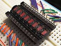 In spite of prevailing evidence, not all LED smart displays were made by Litronix and Hewlett-Packard. RFT, based in Germany, also made smart displays such as this one, the VQC10. Packaged in an attractive red molded epoxy package, the VQC10 has four characters, each containing 35 LED dies arranged in a 5x7 matrix. Unlike many other smart displays, the VQC10 has no built in character driver or other advanced features. The display uses an extremely convoluted control scheme, rows across all digits are ganged together and controlled manually, while each column can be selected by sending a 9 bit address in parallel to the display's driver circuitry. The home experimenter should take note that the VQC10 has wider pin spacing than most DIP LED displays, and will not fit in a conventional breadboard or socket. VQC10 (VQC 10) Datasheet (PDF, 133kb) | |