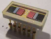 Have you ever wanted a smart LED display that could easily be lost in your pocket? The 490IP1 LED, produced in the former Soviet Union, is a likely contender for the smallest smart LED display in the world. This display has a built in decimal counter and 7 segment encoder etched into a single die, which can be easily seen through the LED's glass front. This display is insanely small; the digit height is only 2.5mm and this device is a tiny fraction of the size of electrically comparable decimal counter LEDs such as the Texas Instruments TIL306. The 490IP1 has a maximum counting speed of 1MHz as well as a carry output that allows multiple LEDs to be chained together. In effect, this LED can be thought of as a functional replacement for the Elesta EZ10B dekatron counting tube, though since the 490IP1 is not filled with chronically leaky hydrogen gas, it is likely a much more robust device. Since the display area of the 490IP1 is very small, the Soviets produced a companion external magnifier designed to work with this LED. The magnifier would clip to the outside of the display and provide a bubble lens over the digit area, to make the display easier to read. | |