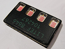 Hewlett Packard's 5082-7000, manufactured in 1969, is believed to be the first smart LED display (ie, a display that includes it's own decoder chip), to ever be commercially produced, as well as HP's first LED display. Hewlett Packard largely ignored the trends then current in IC fabrication and constructed the 5082-7000 in a hermetic metal bathtub package. The digits in this device are somewhat stylized--each is equipped with an extra row of LED dies to allow for the generation of more natural representations of the '4' digit. Very few displays offer this feature, as it significantly increases the number of dies necessary to display a digit. Each of the dies was placed by hand, with tweezers, by HP's team of assemblers. This helps to explain the display's original list price of $75 dollars per unit, a substantial amount of money for 1969. The display includes a built in BCD decoder, which is located above the displayed digit. The leads of this device are attached to the metal can enclosure with glass beads and an internal ceramic substrate acts as a base for the display's internal gold traces. This display was made in both white and gray ceramic versions, the white version is shown here. Note the large metal heatsink mounted under the display, which dissipates the substantial amount of heat this device generates. The 5082-7000 saw use in a historically significant device, Hamilton's 'Pulsar' first generation LED watch. In order for the bulky 7000 series displays to be fit into the watches' casing, Hamilton had special reduced-size ceramic billets constructed by a 3rd party company, which were then sent to HP for installation of the LED dies and proprietary controller ICs. Hewlett Packard 5082-7000 Datasheet (PDF, 415kb) | |